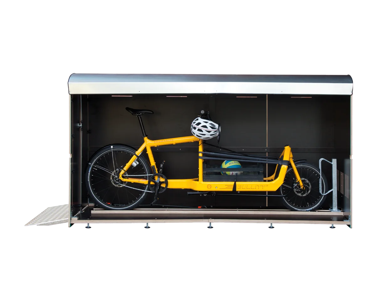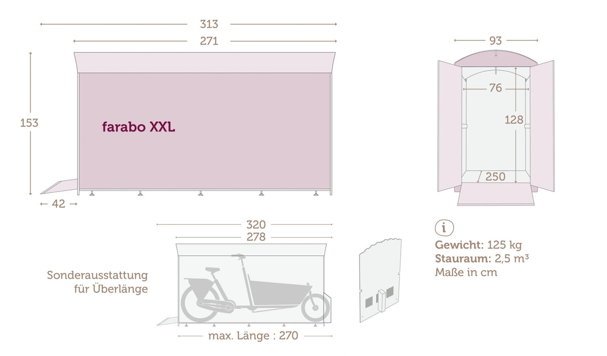 Wenn Sie besonders lange (Elektro-) Lastenräder sicher und witterungsgeschützt verstauen möchten, ist die farabo XXL die richtige Minigarage für Sie. Der Fahrradständer in der Box ist verstellbar und kann so optimal für verschiedene Fahrzeuglängen eingestellt werden. Daneben bietet die farabo XXL Lademöglichkeiten sowie viel Platz für Zubehör.