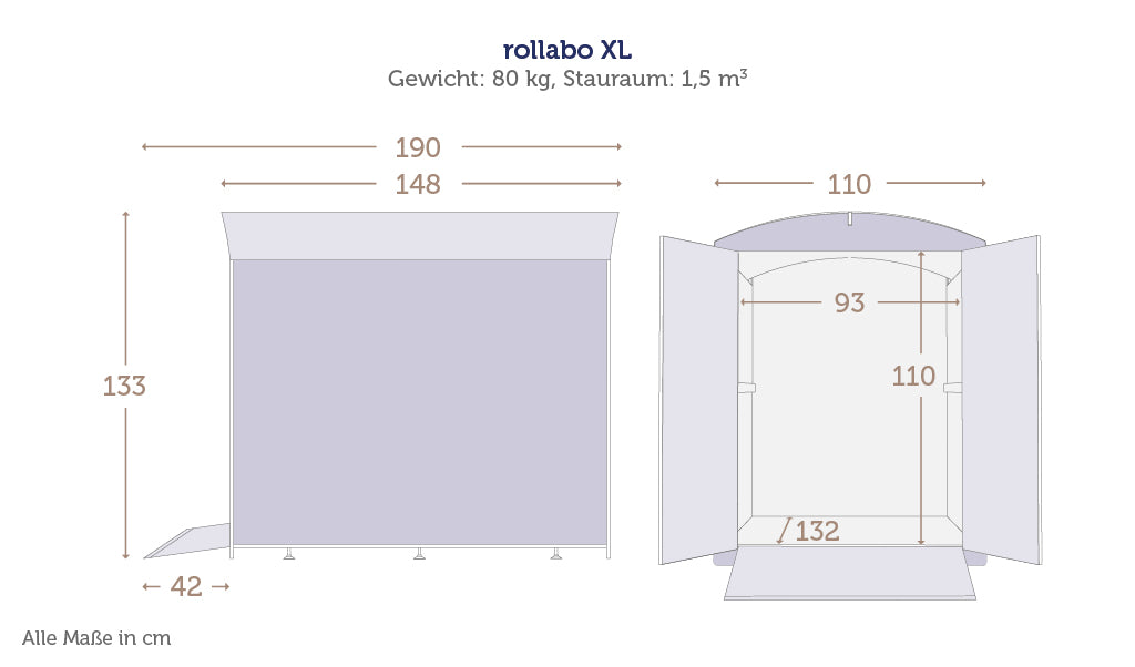Die rollabo XL ist Ihre sichere Minigarage für Elektrorollstühle und E-Mobile. Sie bieten großzügigen Stauraum, zusätzlich auch für Gehhilfen, Regenschirm und sonstiges Zubehör. Ab sofort haben Sie also kein Parkplatzproblem mehr.
