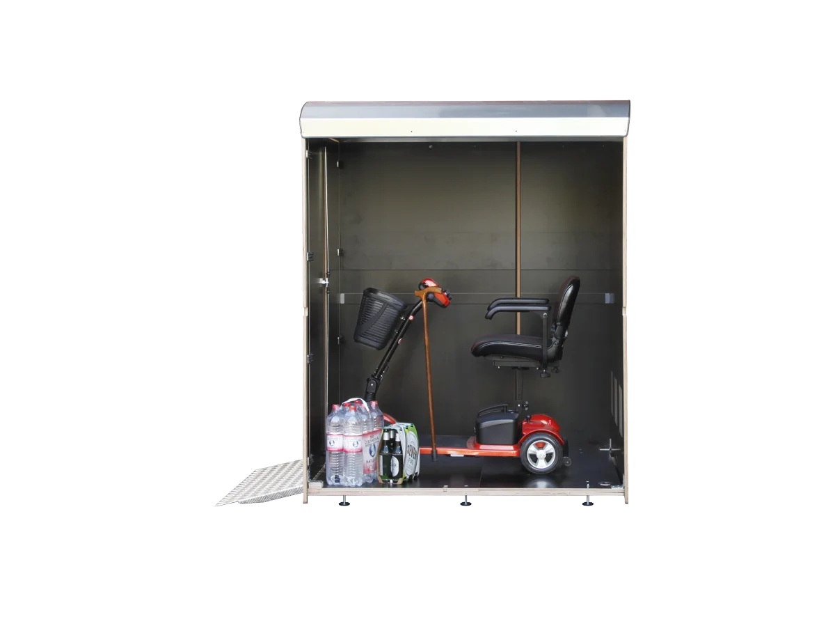 rollabo XL+ ist Ihre sichere Minigarage für Elektrorollstühle und E-Mobile. Sie bietet großzügigen Stauraum, zusätzlich auch für Gehhilfen, Regenschirm und sonstiges Zubehör. Ab sofort haben Sie also kein Parkplatzproblem mehr.