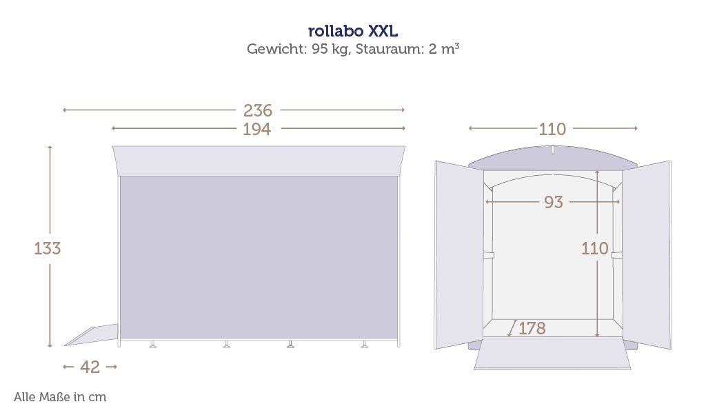 Für lange Elektro-Rollstühle und ein wenig extra Stauraum ist die rollabo XXL ideal. Die wertvollen Geräte können unbesorgt zurückgelassen werden und bekommen ihre eigene Minigarage, in der Sie sie praktisch unterbringen können.